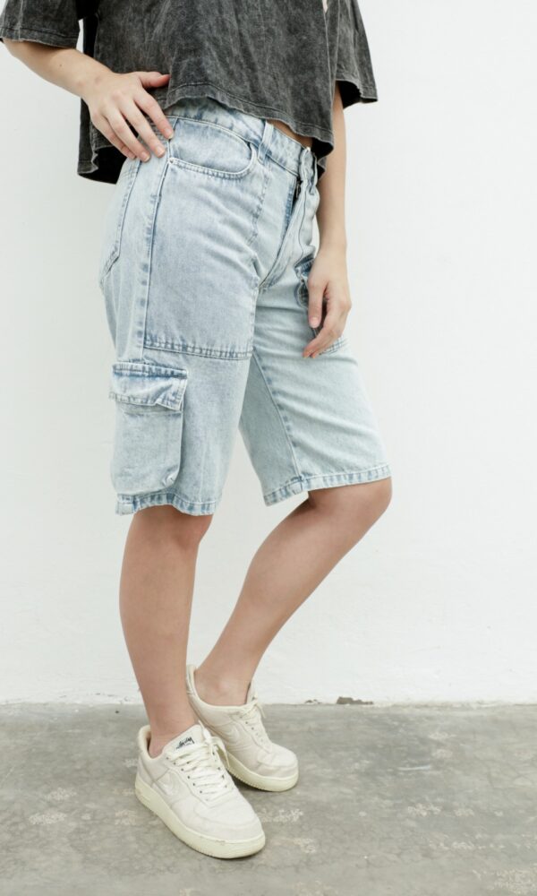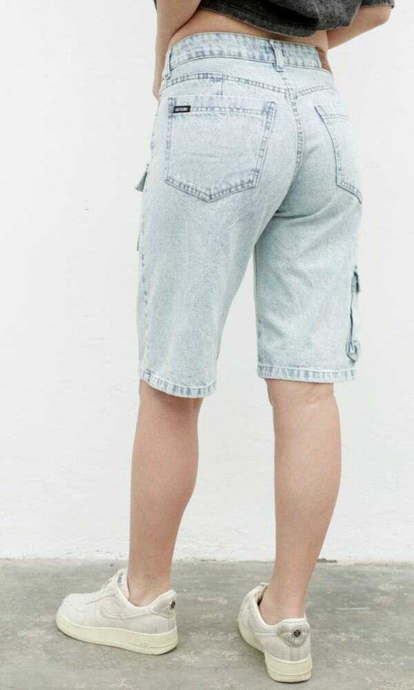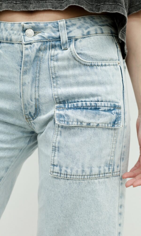 Es de denim rigido tienen 6 bolsillos.